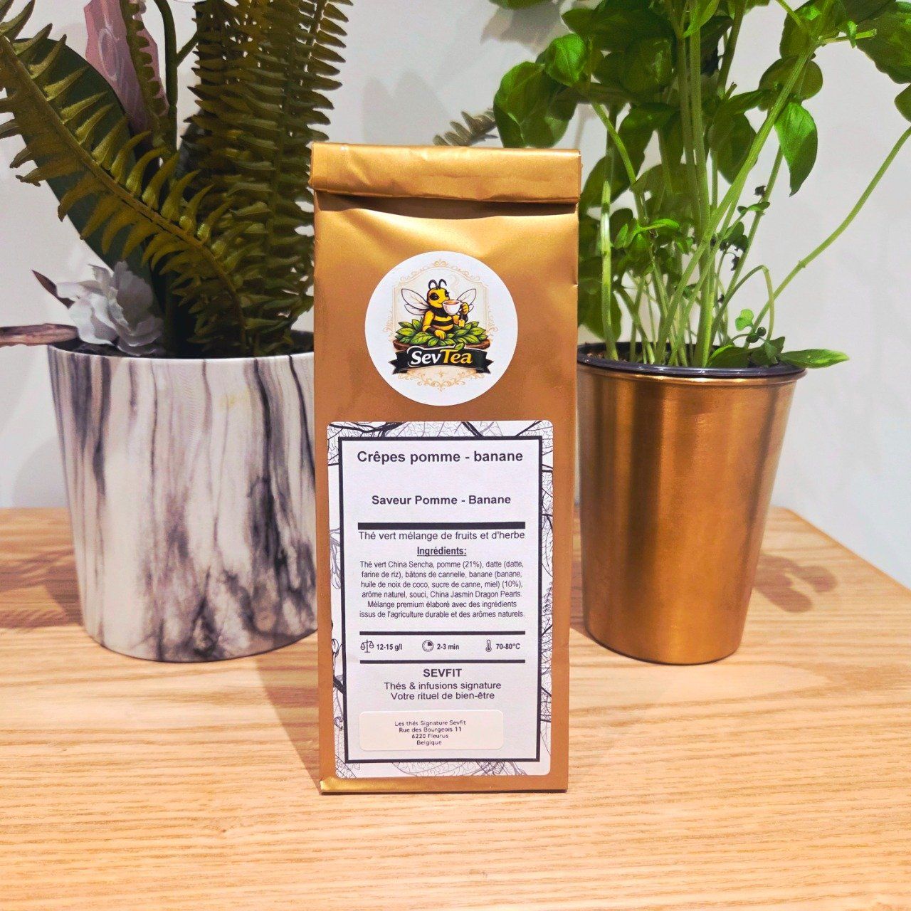 Description brève : Le plaisir d'un goûter d'enfance dans une tasse de thé. Ce mélange de thé vert Sencha et de perles de Jasmin s'unit à la douceur de la banane rôtie et de la pomme caramélisée pour une infusion d'une gourmandise absolue.