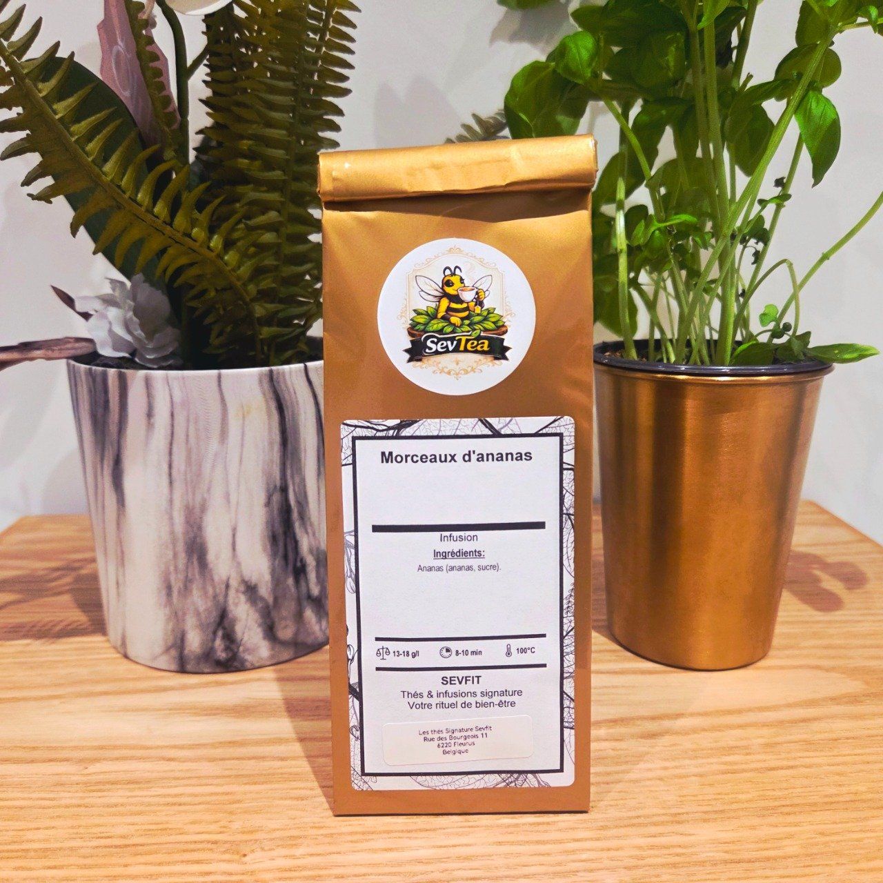 Laissez-vous envoûter par la douceur de notre mélange signature Morceaux d'ananas. Sélectionnés pour leur intensité aromatique, ces fruits séchés libèrent une infusion généreuse et veloutée. Simple, naturelle et intensément fruitée, c’est la boisson plaisir par excellence, à savourer sans modération tout au long de la journée.